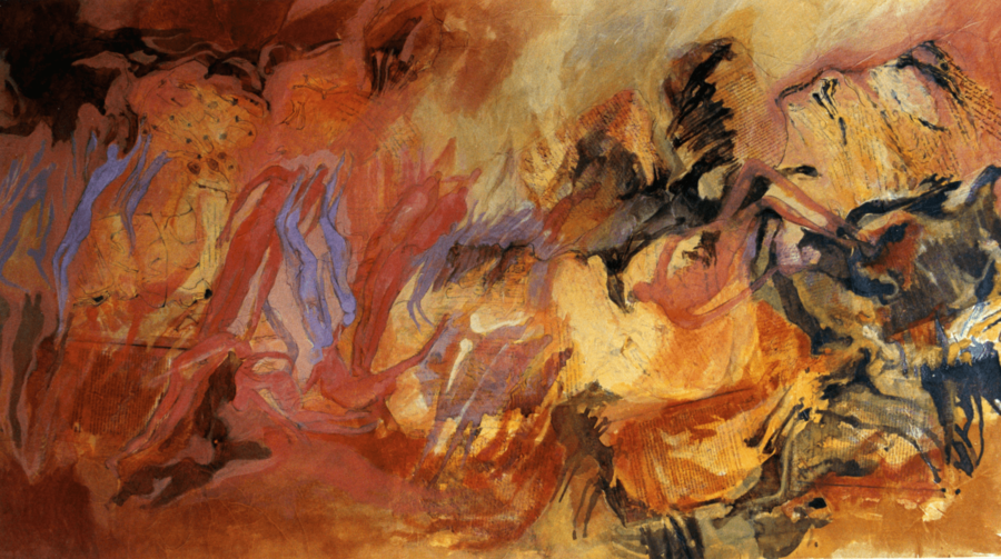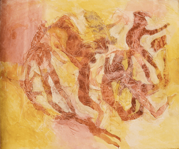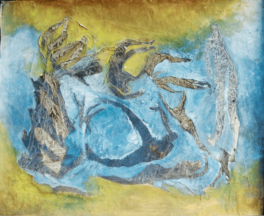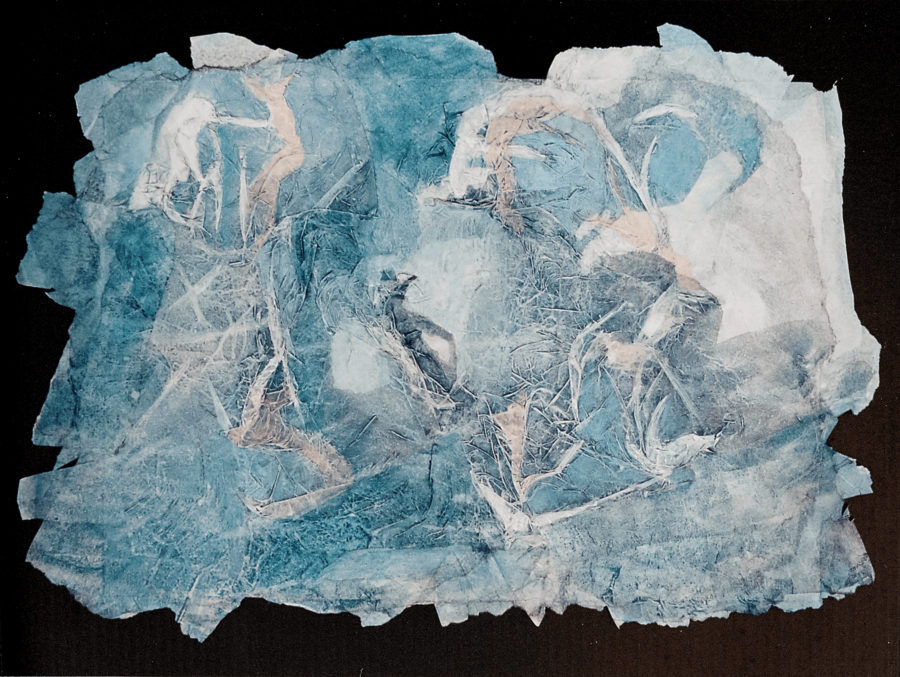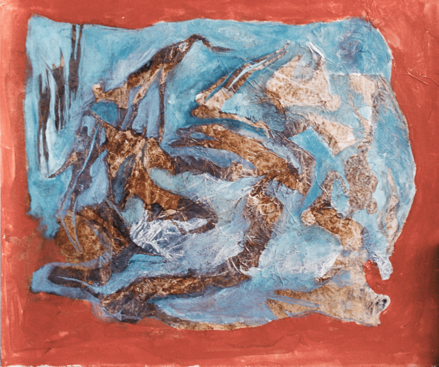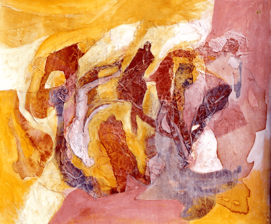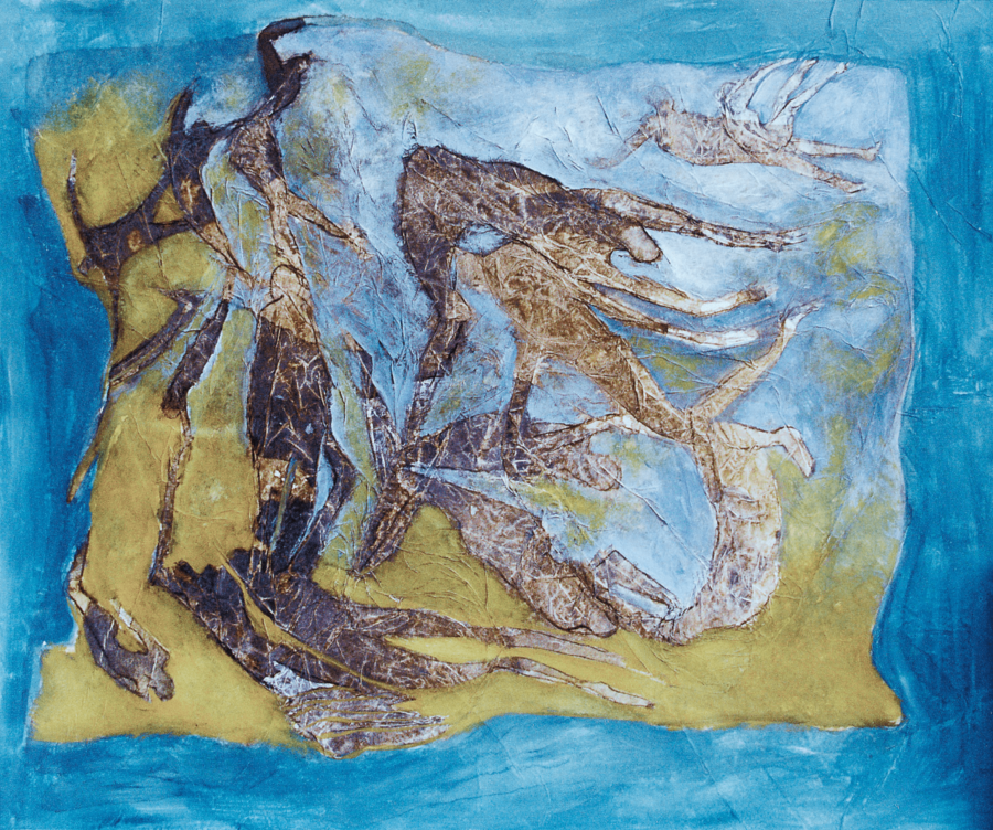 In this series, the human figure automatically emerges as a symbol; in dreamlike, ancestral landscapes, challenging the natural statism of a painting, invading space, coming out of itself, creating with the paper a second skin on the canvas, which brings out the buried, the hidden, making visible a timeless, surreal universe.